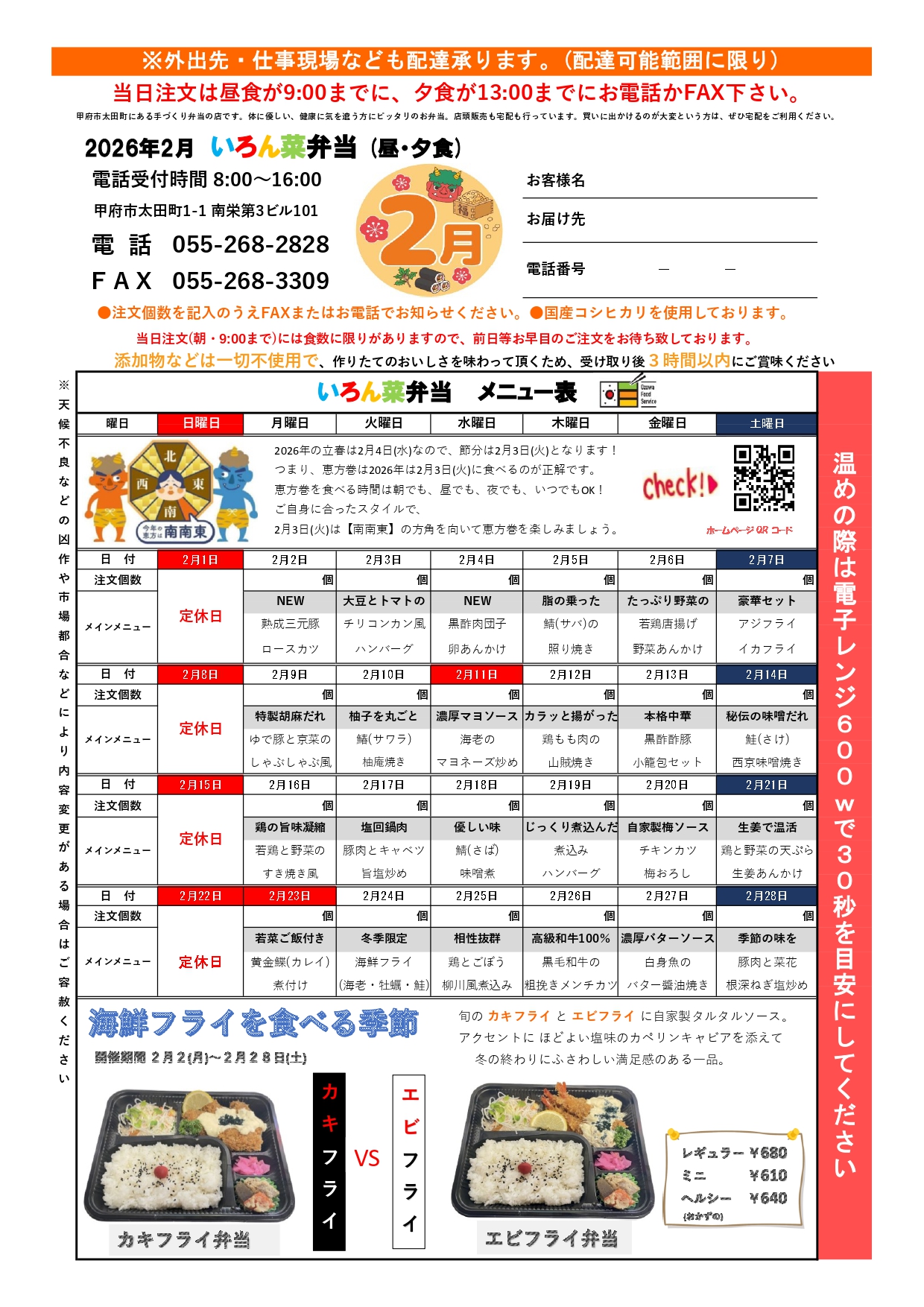・ご注文は昼食9:30・夕食13:00までにお電話又はFAXにてお申込みください。