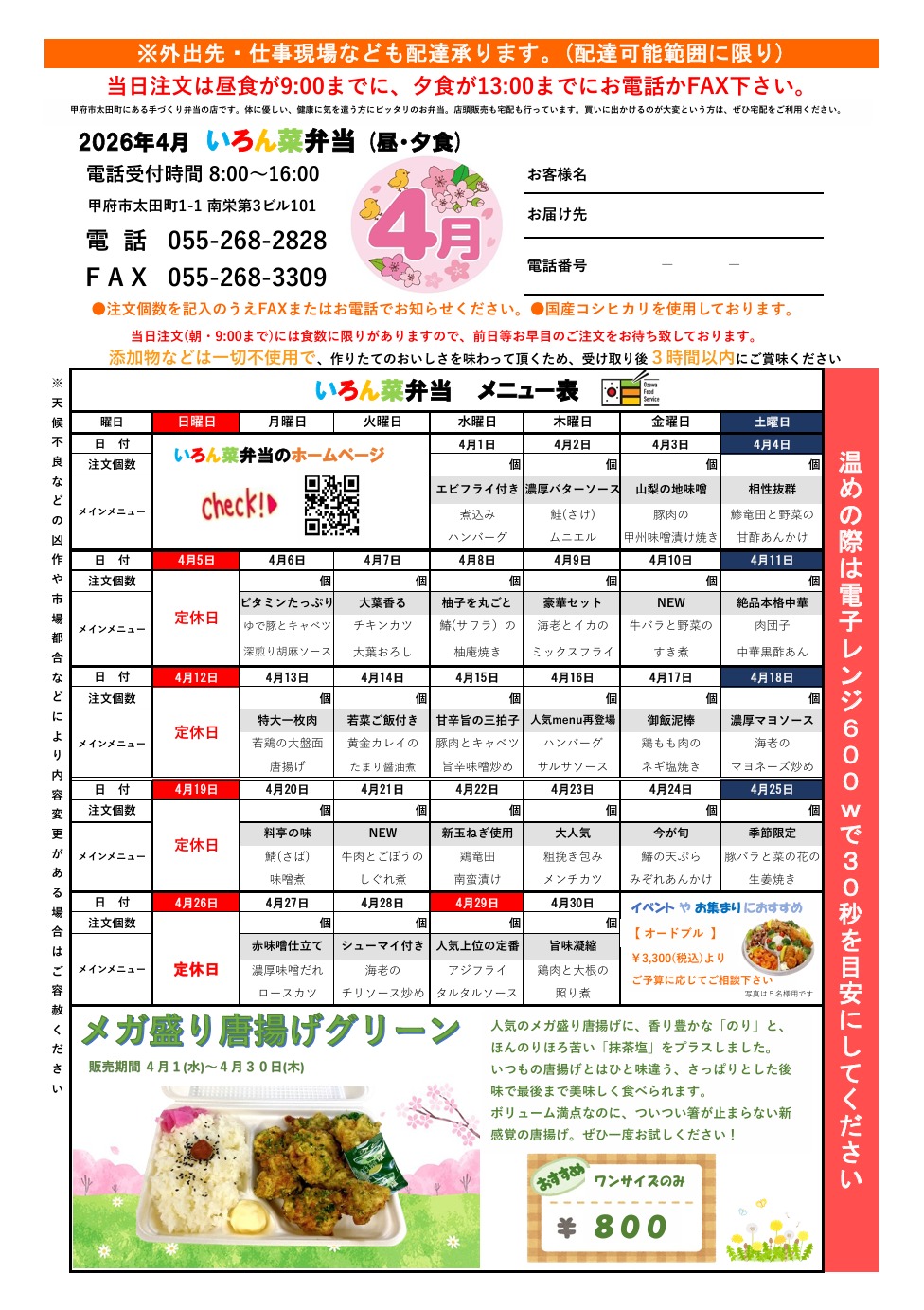 ・ご注文は昼食9:00・夕食13:00までにお電話又はFAXにてお申込みください。